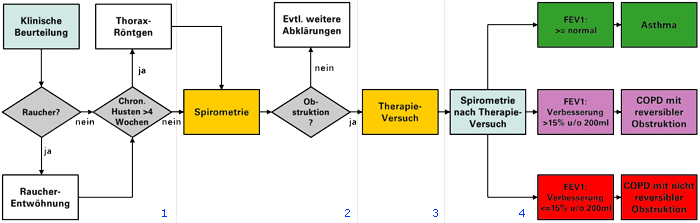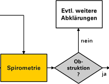 Die Diagnose einer Obstruktion ist gestellt. Das heisst aber noch nicht Behandlungsbeginn. Der entscheidende Schritt jetzt ist der Therapiever-such, der kombinierte Einsatz von systemischem Kortison und Bron-chodilatatoren. Er zeigt uns, ob und wie weit die Obstruktion reversibel ist. Mit dem Therapieversuch wird die therapeutische Marschrichtung fe-stgelegt.