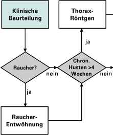 Erste Begegnung und klinische Untersuchung eines Patienten mit me-hrwöchigem Husten, Auswurf, mit oder ohne Atemnot. Erste Intervention zum Nicht-mehr-Rauchen. Ein Thoraxröntgenbild in dieser Phase dient dem Ausschluss eines Tumors.