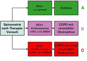 Jetzt ist alles klar: A, B oder C! Dank diesem einfach strukturierten Vor-gehen wissen wir, ob wir es mit einem Asthma (volle Reversibilität) oder einer COPD mit teilweiser oder fehlender Reversiblität zu tun haben. Erst jetzt haben wir alle Fakten, um eine zielgerichtete Behandlung in die Wege zu leiten.